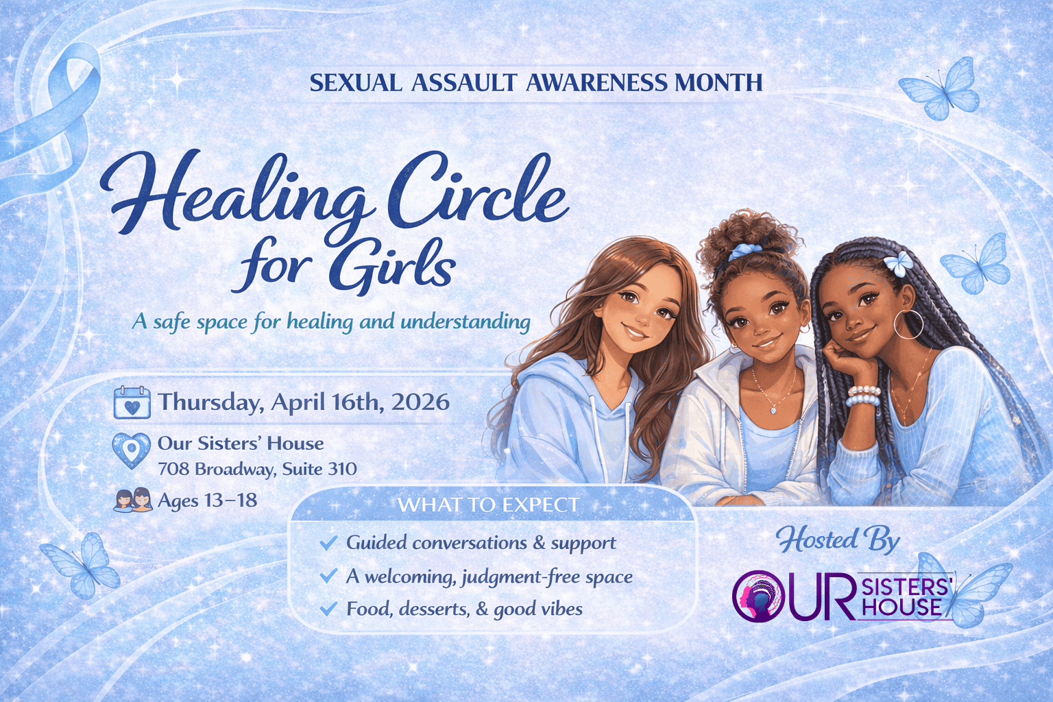 This event may include discussions around sensitive topics such as relationships, boundaries, and personal experiences. All conversations are trauma-informed, age-appropriate, and completely voluntary — there is never any pressure to share.
